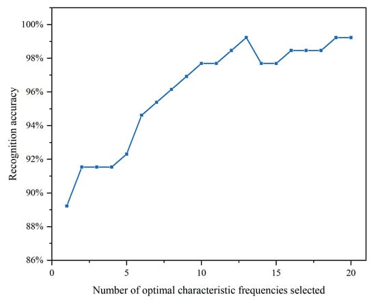 Step 3. The first m (m = 1, 2, …, 20) optimal characteristic frequencies of each feature are selected each time and processed by the SVM model to obtain the recognition result as the selection criterion. The result is shown in Figure 11.