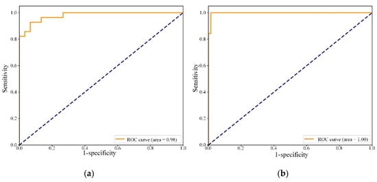 Receiver operating characteristics (ROC) graphs showing classification performances. (a) Song et al.’s method []; (b) Our proposed method.