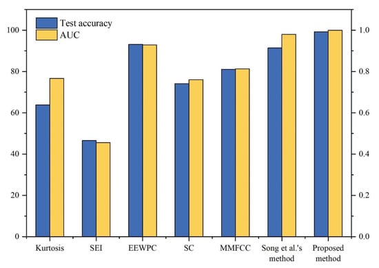 Therefore, residual variance and fractal dimensions are selected to obtain the optimum of feature subset. As shown in Figure 12b and Figure 13 and Table 2, the test accuracy and AUC of the compared methods are 91.38% and 0.98, respectively. The proposed method’s test accuracy, test accuracy and AUC are 99.23% and 1.00, respectively. The result shows that the features extracted by the AN response model are more effective and advantageous than those obtained by the MF-score feature reduction method.