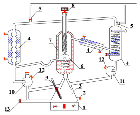 1—magnetic heating plate; 2—feed port; 3—boiling chamber; 4—condenser; 5—vacuum interface; 6—balance room; 7—insulation layer; 8—digital thermometer; 9—thermocouple thermometer; 10—liquid sampling port; 11—sampling port for gas phase (condensate); 12—sample room; 13—drain port.