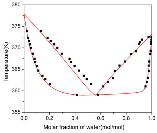 Numerical results of the isobaric VLE measurements carried out in the present work for the system H2O (1) + PODE2 (2) are given in Supplementary Materials Table S1. Experiments showed that an azeotrope exists between water and PODE2. In this paper, we verified the experimental data by means of the Herington test for thermodynamic consistency [47]. The plot of ln(γ1/γ2)—x1 is illustrated in Figure 2, and it provides that the criteria value of |D − J| is = 4.50 < 10, indicating that the measured VLE data are in good agreement with thermodynamic consistency.