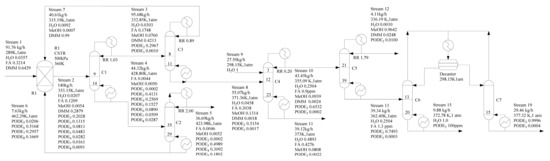 For the anhydrous case, the process of PODEn produced from trioxane and methylal developed by Burger et al. [29] is applied (see Figure 10). For other water content, the process of PODEn produced from methylal, trioxane, formaldehyde, and water by from our work is applied (see Figure 4).