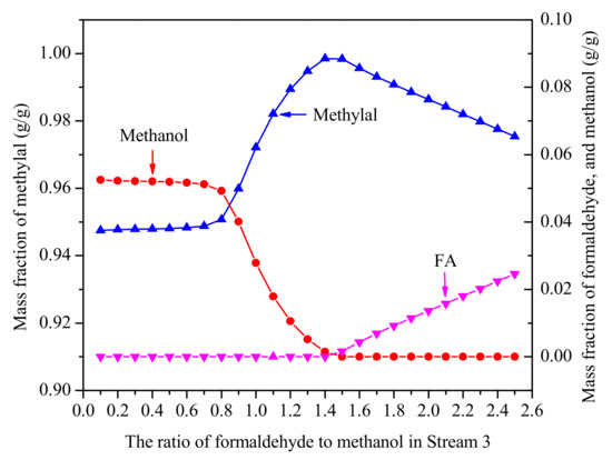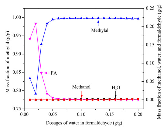 A FA/MeOH ratio of 2 is shown in Figure 6b. The results show that the content of methylal increases first and then decreases with the increase of water content, formaldehyde decreases first and then disappears, methanol appears first and then increases, and water also appears in the substances on the top of the distillation column. It can be concluded that when the FA/MeOH ratio is greater than 1.5, appropriate water content is helpful to increase the content of methylal. When the FA/MeOH ratio is higher than 1.5, excessive formaldehyde is enough to completely react with methanol. When water is added to the system, water reacts with formaldehyde to the polymers of MGn from Equations (1) and (2). Therefore, the concentration of formaldehyde at the top of the distillation column decreases and the concentration of methylal increases. When limits are exceeded, water competes with formaldehyde. The result is a decrease of methylal and an increase of methanol.