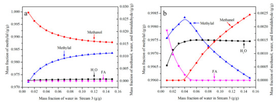 The effect of water content is shown in Figure 6a,b. Two orientations need to be discussed in the conditions (N = 40, RR = 2). One is when FA/MeOH ratio is less than 1.4, and the other is greater than 1.5. Therefore, FA/MeOH ratio was selected 1 and 2 respectively. FA/MeOH ratio of 1 is shown in Figure 6a. At this point, the main composition of mixture from the top of the distillation column is methylal, trace of methanol, trace of water and almost no formaldehyde. It is not necessary to increase the water content without restriction and limit the water content to 0.15, as higher concentrations of water lead to considerably decreased yields of PODEn in the reactor [31]. With the increase of water content, water appeared, methanol content decreased and methylal content increased. The results showed that the presence of water was beneficial to increase the concentration of methylal. When the FA/MeOH ratio is less than 1.4, formaldehyde is not enough to completely react with methanol. When water is added to the system, water-PODE2 azeotrope is more stable than FA-MeOH-PODE2 azeotrope which appears in physico-chemical model. Formaldehyde is released to form HFn to combine more methanol, so that the content of methylal increases and the content of methanol decreases.