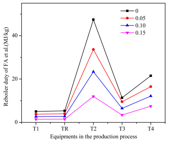 According to trioxane preparation process [33,52] given in Figure 8, we now separate chain-group providers containing formaldehyde, trioxane and water as the bottom product from column T3 by changing the bottoms rate. For reboiler duty per unit mass of the chain-group providers containing formaldehyde, trioxane, and water, the reboiler duty of each equipment in the process is shown in Figure 9. It can be seen that allowing water and formaldehyde in feedstock can reduce reboiler duty. As the allowable water content and formaldehyde increase, the circulation does not have to be increased to improve the quality of the product, which has a significant impact on column T2.