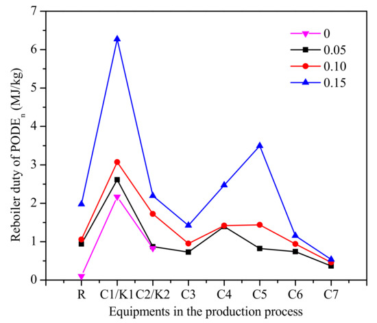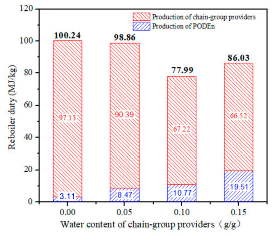 The reboiler duty of each equipment in the process is shown in Figure 11. As can be seen from Figure 11, the reboiler duty of column C1 and C2 increases with the increase of water content. The role of the column C1 is the separation of PODEn≥3 as the bottom product from mixtures of formaldehyde, water, methanol, methylal, and PODEn≥2. The role of column C5 is separating methanol as a top product from mixtures of water, methanol, and PODE2. This means that the reasons for the increase of reboiler duty are the increase of methanol in the reactor by decomposition and the decrease in the conversion rate of PODEn. It should be noted that since only the reboiler duty is considered, the accurate cost of the product needs further analysis required to decide which PODEn synthesis process is economic.