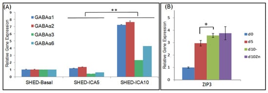 3.2. GABAA Receptors and ZIP3 Transporter mRNA Levels Increase during Differentiation of SHED into SHED β-Cells