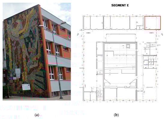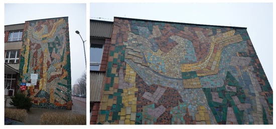 The outer longitudinal walls are made of prefabricated reinforced concrete blocks with a corrugated outer surface mounted on transoms. Gable walls, in compliance with the archival design documentation from the 1960s, were made in the form of foam-gas-silicate blocks (Table 1). The façade is finished with ceramic façade tiles of the dimensions of 0.185 m × 0.09 m and the thickness of 0.02 to 0.03 m. The texture of the façade in window sill strips and attics was concrete and corrugated. On one of the outer walls of the building there are glazed ceramic tiles which are viewed as an element of “contemporary art” (Figure 1).