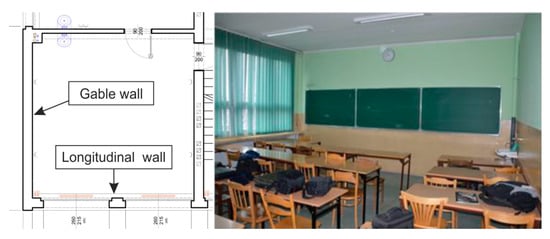 The heating system in the room was made with the use of panel radiators. The heat source was located in the local gas boiler room. Thermographic measurements were taken during the semester break, when the temperature of the internal air decreased. The first measurement was made at the beginning of this period, for the temperature of +19.3 °C. The outside air temperature was 2.7 °C. The next measurement after the completion of thermal insulation works was carried out at a lowered internal air temperature of 17.0 °C and lowered external air temperature of −2.5 °C.