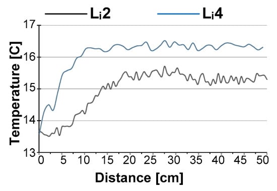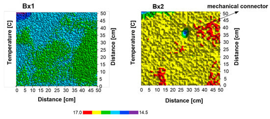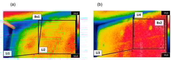 The analysis of thermographic measurement results before the application of the insulation (Figure 4a) and after the application of the insulation (Figure 4b) for different environmental conditions on both sides of the envelope indicates that there is a change in the character of temperature distribution. It is demonstrated on the diagrams along the lines Li3 and Li4 (Figure 5 and Figure 6). The course of temperature changes along the line Li3 determined from the corner of the outer walls shows that there is a significant reduction of the impact of the geometric linear bridge after the insulation. We can observe a sharp change in temperature on the outer wall surface at the distance not exceeding 0.15 m, followed by its stabilization. Before the insulation, the temperature on the wall surface along the line Li1 stabilized at the distance of about 0.55 m from the corner (Figure 5 and Figure 6). A similar situation can be observed for the line Li2 at the junction between the wall and the ceiling (Figure 5 and Figure 6). The measurements were made at a small angle to the wall surface in order to minimize the influence of reflected radiation. If the measurements had been made at right angles to the surface, they could have been distorted. Based on the information about the distance of the thermal imaging camera from the tested wall and knowing the selected actual characteristic dimensions, lines Li1 and Li3 perpendicular to the curtain wall of the same direction and approximately the same length were determined. Similarly, lines Li2 and Li4 perpendicular to the ceiling surface were determined. When examining the temperature field Bx1 before the thermal insulation, we can observe its slight surface variation (Figure 7). The lowest temperature was recorded in the fragment of the wall-to-ceiling connection. The distribution of temperature on the insulated surface (Bx2) allows to identify connections between individual thermal insulation elements in which a slight decrease in temperature on the inner wall surface is observable (Figure 4). Additionally, a decrease in temperature on the surface of the insulation is observed at the place of the existing mechanical connector (Figure 7). This may be caused by the change of heat conductivity coefficient, although a slight influence of the change in emissivity at this place cannot be ruled out.