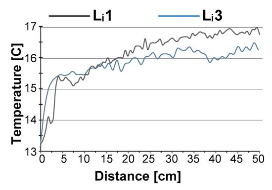 The emissivity of finishing layers of the wall was determined by the comparative method with respect to the reference tape with the known emissivity of 0.96. The emissivity of the inner plaster determined on this basis is 0.92. Due to differences in the emissivity of the individual selected types of façade ceramic tiles, ranging within 0.89–0.93, the average emissivity of 0.91 was determined for a given surface. The temperature of indoor and outdoor air for the measurement No. 1 (the wall without thermal insulation) was respectively ti = 19.3 °C, te = 2.7 °C, while for the measurement No. 2 (after applying the insulation from the inside) it was ti = 17.0 °C, te = −2.5 °C. The results of thermal imaging measurements before and after the application of the insulation layer on the inner wall (Figure 2) surface are presented in Figure 4, and the results of temperature as a function of distance px are presented in Figure 5, Figure 6 and Figure 7.