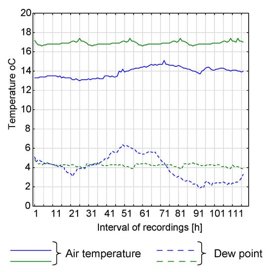 The use of thermal insulation from the inside of the wall also has a significant impact on the microclimate in the room. The measurement results of the indoor air temperature, humidity, and dew point temperature are presented in Figure 8.