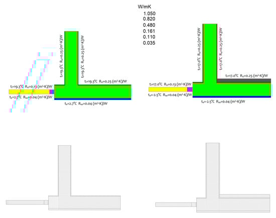 The connections of the outer wall with the internal wall together with the window generate the following heat losses before the insulation: heat flux Φ = 75.58 W, thermal coupling coefficient L2D = 4.55 W/(m·K) and linear thermal transmittance coefficient Ψ = 0.78 W/(m·K). It should also be noted that at the juncture of the outer wall with the window on the inner surface the temperature is reduced to the level of tmin = 11.02 °C—Table 8.
