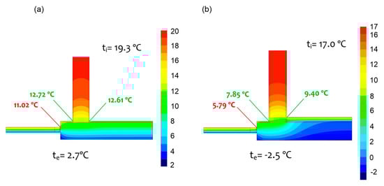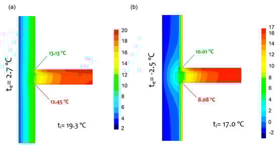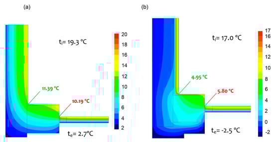 Simulated temperature distribution, of the connection of outer walls: (a) simulations without thermal insulation; (b) simulations with thermal insulation.