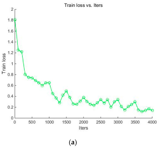 Figure 8a shows the relationship between the training loss value and the number of iterations. Although the training loss value fluctuates a little during the iteration process, it shows a downward trend as a whole. When the iteration is completed, the training loss value was around 0.2. Figure 8b shows a graph of accuracy. When the number of iterations was 1500, the accuracy of the proposed algorithm reached 90%. Accuracy continued to increase as iteration quantity increased until reaching a maximum of about 98%.