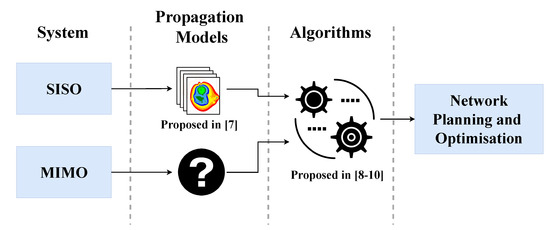 Operator’s DT campaigns using MIMO systems are still very limited and they only depict specific scenarios (e.g., two transmitting antennas and two receiving antennas), while DT campaigns for SISO systems are more widely available. The motivation for this study lies in the possibility of using these SISO DT campaigns, so as they can be used with propagation models for MIMO systems, which immediately brings a great cost advantage. The use of this methodology enables a simple estimation of coverage for a MIMO system, allowing for the application of algorithms for network planning and optimisation. In Figure 1, the motivation for this study is depicted.