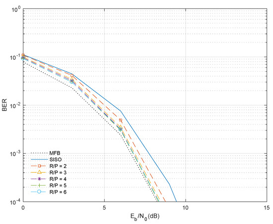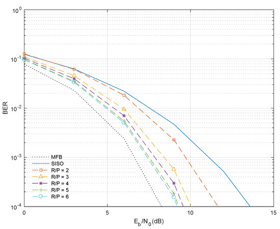 Using the previous equations, it is now possible, for a given BER performance, to know the impact on the ratio of changing from a SISO system to a MIMO system. Note that this relationship is a function of the ratio, so the higher this ratio the greater the impact. As an example, and according to Equation (27), for a BER of and the first iteration of IB-DFE, the value of , improves by approximately dB ( dB), when moving from a SISO system to a MIMO system with 2 transmitting antennas and 10 receiving antennas ().