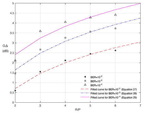 Through the fitted curves, shown in Figure 6, it is possible to predict the (the difference between SISO and MIMO systems for a given BER performance), considering the variation in the ratio. For the first iteration and considering a BER performance of the fitted curve is given by Equation (27). Equation (28) corresponds to a BER of and Equation (29) denotes the fitted curve for a BER of .