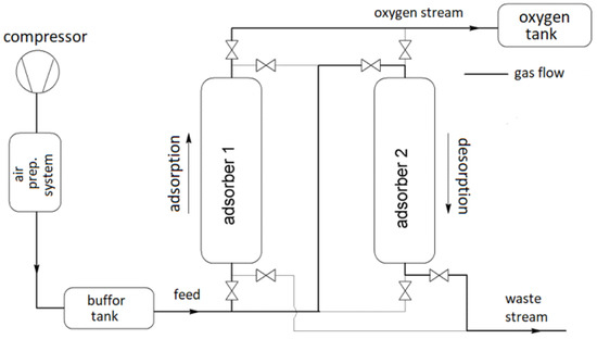 The most frequently used adsorbents for the separation of oxygen with a purity of up to 95% are 5A and 13X zeolites. Studies showed that both adsorbents behave stably over a wide pressure range and allow for predictable operation of the oxygen separator. The literature indicates that devices using zeolite 5A are characterized by the higher efficiency of oxygen separation compared to devices using zeolite 13X under the same process conditions [21]. This paper focuses on the most popular commercially available low-capacity oxygen generator PSA type using 5A zeolite. The schematic diagram of the generator is shown in Figure 1.
