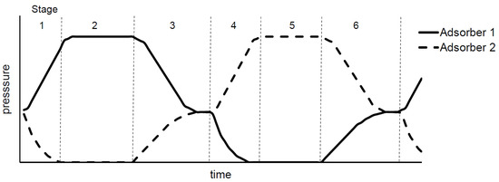 To optimize the operation of the oxygen generator, the adsorption cycle was mapped into individual stages of pressure changes inside the adsorption tanks. The cycle of pressure changes is shown in Figure 2.