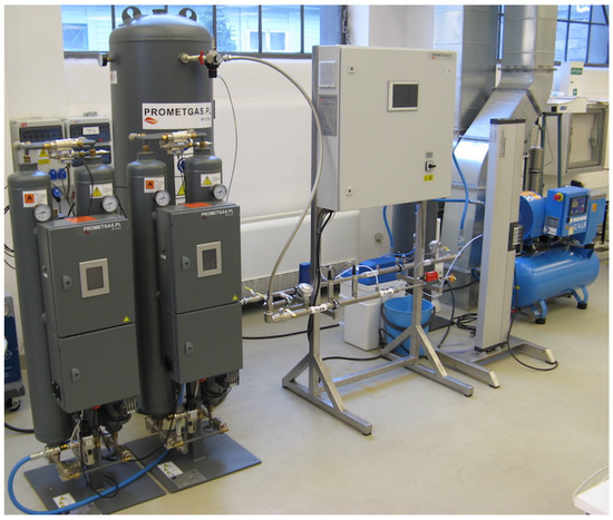 The test stand was built using a standard, commercially available low-capacity PSA oxygen generator. It consists of an air compressor, air dehumidifier and filters, air tank, oxygen generator, and oxygen tank. The schematic diagram of the stand is shown in Figure 1. The view of the PSA oxygen generator is presented in Figure 4.