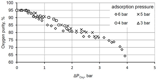 In Figure 5 it can be seen that high oxygen purity (95%) is maintained if the difference between the adsorption pressure and the pressure in the oxygen reservoir is less than 0.5 bar. Above this value, there is a decrease in the purity of the separated oxygen. When the pressure difference exceeds 3.5 bar, the oxygen purity drops sharply. It is, therefore, possible to control the required oxygen purity with the control of the value.