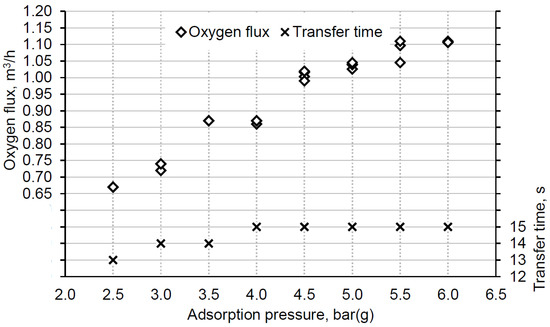 During the measurements, the required operating pressure was set, and the transfer time was gradually increased to find its maximum value, at which the oxygen purity remains at the level of 95%. For the determined transfer time, the oxygen flux was adjusted such that was 0.5 bar at most. Three measurements were performed for each adsorption pressure from 2.5 to 6.0 bar(g) in 0.5 bar increments. The measurement results are shown in Figure 6.