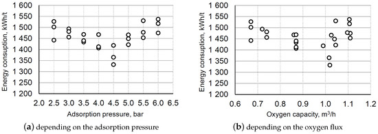 The aim of the measurements was to determine the energy consumption of the oxygen separation process with optimal generator settings. Three measurements were made for each adsorption pressure from 2.5 to 6.0 bar(g), every 0.5 bar (24 in total). For each adsorption pressure, the optimal transfer time and the oxygen flux determined in the third stage were set. The measurement results are shown in two figures—depending on the adsorption pressure (Figure 7a) and the oxygen flux (Figure 7b).