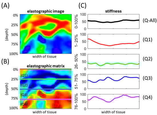 The stiffness of the plantar foot was calculated based on the strain ratio of the elastographic images [,]. First, a rectangular area was drawn on the B-mode image to define the soft tissue region between the skin and bone at the first metatarsal head (Figure 1B). Then, the corresponding elastographic image was superimposed on the B-mode image to define the soft tissue over the first metatarsal head area (Figure 1C). The 5 ultrasound scans were then used to represent soft tissue under the first metatarsal head (Figure 1D). The pixel value of the elastographic image (Figure 2A) was converted to 100 levels (Figure 2B), representing soft (level 1) to hard (level 100) [,]. The pixel value of the elastographic image is usually shown in the RGB format for visual inspections by clinicians. In an elastographic image obtained by elastographic ultrasound, the strain ratio is a numeric scale ranging from level 1 (red color indicating soft) to level 100 (blue color indicating hard). In this study, RGB values of elastographic images are defined as (1,0,0) as red, (0,1,0) as green and (0,0,1) as blue []. The color map level was converted to use blue as soft (level 1) and red as hard (level 100) (Figure 2B). The mean strain ratio of the plantar soft tissue was calculated within this rectangular area []. Third, the stiffness of the metatarsal head, from the skin to the bone (Q-All), was evenly divided into four layers, including the superficial layer (from the skin surface, Q1), sub-superficial layer (Q2), sub-deep layer (Q3) and deep layer (Q4) (Figure 2B).