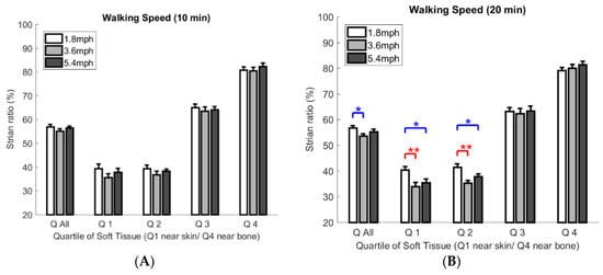 Comparisons of the effect of walking speeds (1.8, 3.6 and 5.4 mph) on the plantar tissue stiffness of the first metatarsal head at two walking durations (A) 10 min walking duration and (B) 20 min walking duration). There is a significant difference in the plantar stiffness (Q-All) between 1.8 and 3.6 mph (56.8 ± 0.8% vs. 53.6 ± 0.9%, p = 0.017). In the superficial layer (Q1), there is a significant difference between 1.8 and 3.6 mph (40.4 ± 1.3% vs. 34.0 ± 1.5%, p = 0.003) and between 1.8 and 5.4 mph (40.4 ± 1.3% vs. 35.5 ± 1.4%, p = 0.018). In the sub-superficial layer (Q2), there is a significant difference between 1.8 and 3.6 mph (41.4 ± 1.4% vs. 35.3 ± 1.0%, p = 0.001) and between 1.8 and 5.4 mph (41.4 ± 1.4% vs. 37.9 ± 1.0%, p = 0.040). Data are shown as mean ± standard errors. *, a significant difference (p < 0.05). **, a significant difference (p < 0.01).