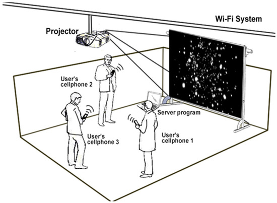 By operating a client app that has been downloaded to facilitate the interaction, messages are sent via Wi-Fi, by means of a gyroscope controlling speed and gravity, to a computer. By doing so, the stable condition of the animated images will be changed on the monitor and the movement of stars will speed up, as they continue to collide with each other. Therefore, Big Band, the cloud-like galaxy, will cause cosmetic swirling. Three to nine people can randomly join or leave the interaction at the same moment, as shown in Figure 1. The Wi-Fi system is a mini telecommunications base station. Even if there is no limit on the number of connections, after reaching a certain number of people (more than 10 people), signal transmission congestion will occur, and there may even be problems such as disconnection and failure to connect the server’s IP. To increase the demand for a large number of connections for users, it is necessary to build a Wireless Array to increase the load of the number of connections. In the exhibition space of the library, it is suitable for less than 10 people that can move freely. Therefore, we only built one Wi-Fi receiver, instead of building a wireless array.