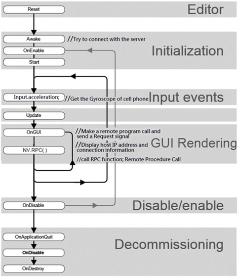 By taking Unity Engine, this research used C# language to write the connecting socket application for the client with the server via Wi-Fi. In the phase of initiation, the server makes connections with the client server when the users shake their phone to send gyroscope messages. Once the messages are received, the connection is made. The client app procedure is explained in Figure 2.