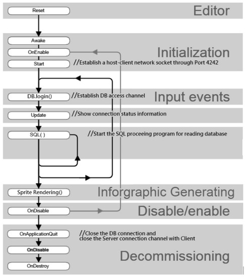 As seen Figure 3, OnEnable( ) on the server model indicates that a message is to be sent to the client server to request a connection. The connection of the socket will be made through Port 4242 once the message is received, and MS SQL Database Management will request a DB inquiry signal to create an access channel. Once the DB access channel is created, SQL is shown on the server model, indicating a message is to be sent to the SHU library server. Therefore, the library borrowing data from 2013 to 2015 will be selected, and a report of the book borrowing statistics will be sent back to the server. Based on the information that the server receives from the library server, the galaxy of universe dynamic sprite renderings will proceed, and as the book titles and borrowing information are animated on the monitor, a galaxy rotation visual effect infographic will be presented. Once the gyroscope is stopped by the user, the DB access channel is closed and the connection between the server and the client-server will be disconnected. The connection between the server and client-server is illustrated in Figure 4.
