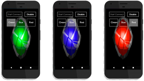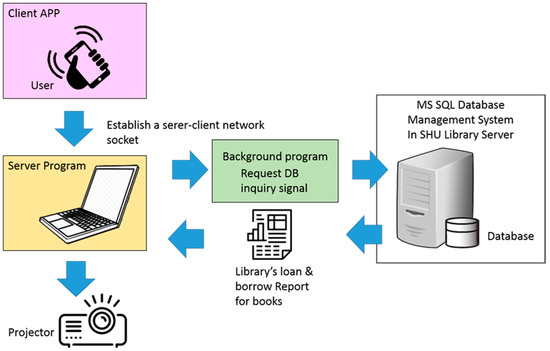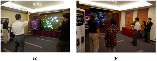 Figure 5 shows the client app UI design. There are five buttons on the interface, including the ‘Start Connect’ button for activating the server connection and the ‘Disable’ button for ending the connection. The other three buttons are Red, Green and Blue, all of which can control the star color on the monitor. Users can control the buttons together at the same time to create a color mixing effect. There are 256 color combinations, which can give diverse visual effects. If desired, users can repeat the interaction or are free to leave the process when they choose. During the interaction process, the server will make a connection to the HSU Library database to collect book borrowing information, and then present this data through the projector on the monitor. As the phone stops shaking, and all the users turn off the app and leave the interaction, the image on the monitor will go back to the original state of silence, and the stars in the universe will go back to their original luminous white. This research was performed at the HSU library from 12/16/2015 to 12/21/2015 during the exhibition, and 300 to 400 people engaged with the interactive art, as shown in Figure 6a,b. The library book borrowing data analysis is explained in Figure 7. In Figure 7a, each book title and its number of loans per book can be visualized by user launch his smart phone’s gyroscope. While in Figure 7b, the service data for number of books loaned by the library was displayed as the information visualization of big data on the screen. The color of the device according user’s choice in Figure 5 will be related to the color display of the area in Figure 7b. If the user chooses green, green will be displayed for the book borrowed.