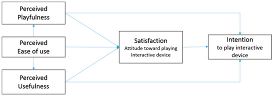 Both internal and external factors may affect the intention to use information technology [36,37]. The internal factor in this research is the sense of excitement and playfulness that comes from engaging with the operating system. The external factors are the goals or rewards that can be achieved by using the operating system [36,38,39]. ‘Perceived playfulness’ is positively related to the internal and external factors of user acceptance, as testified by related research on the Internet [35,40], virtual stores [41], AR teaching systems [17,42] and online games [36,43]. Perceived playfulness in this research is defined as the joyful feeling that the user experiences during their interaction with the interactive artwork. We proposed that ‘perceived playfulness’ should help convey the theme of the artwork and increase user satisfaction.