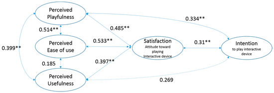 Moreover, according to the results of the correlation coefficient analysis, we propose that the perceived ease of use is not related to the perceived usefulness, and the perceived usefulness is not related to intention. The other constructs are all positively related to one another, which means that this research model explains the construct correlation of the interactive artwork usability. As can be seen in Figure 9, the results show that perceived playfulness is closely linked to the factors of satisfaction and intention. This suggests that interaction can create entertainment, as the degree of satisfaction with the library information services should impact users’ intention to reuse this interactive artwork. Thus, in this case, interaction can create entertainment. In this way, this research model adequately explains the usability of the interactive artwork.