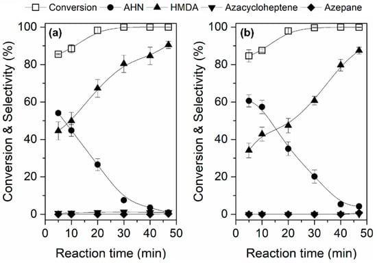 As shown in Figure 1, the ADN hydrogenation reactions over the Raney Ni and Co catalysts achieved almost complete conversions of ADN (>99%) within 30 min, yielding HMDA as the major product. Figure 1 and Figure 2 show that, as the reaction proceeds, AHN is hydrogenated to HMDA via a highly reactive imine intermediate [] that was not observed in the product samples. For the Raney Ni catalyst, a quantitative conversion of ADN was achieved within 47 min, with an AHN and HMDA selectivity of 1% and 90.5%, respectively (Figure 1a). However, for the Raney Co catalyst, the AHN and HMDA selectivities were 4.3% and 87.5%, respectively, with a nearly quantitative ADN conversion within 47 min (Figure 1b). Other than AHN and HMDA, small fractions of azacycloheptene and azepane were also formed (Figure 2). Intermolecular condensation of the imine intermediate with the amine products (AHN and HMDA) and intramolecular cyclization lead to the formation of azacycloheptene and azepane []. The total carbon balance ranged from 85 to 100%, indicating small fractions of byproducts undetected by the GC–FID.