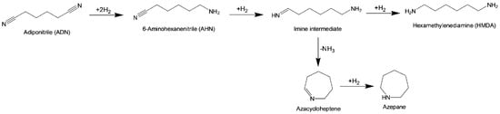 - Hoffer, B.W.; Moulijn, J.A. Hydrogenation of dinitriles on Raney-type Ni catalysts: Kinetic and mechanistic aspects. Appl. Catal. A Gen. 2009, 352, 193–201. [Google Scholar] [CrossRef]