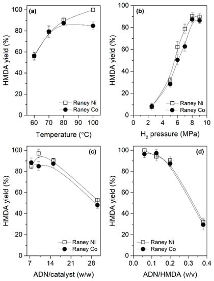 Yield of HMDA obtained via hydrogenation of ADN as functions of the following reaction conditions: (a) reaction temperature (reaction conditions: PH2 = 8 MPa; ADN/catalyst (w/w) = 15; ADN/HMDA (v/v) = 0.2; t = 47 min); (b) H2 pressure (reaction conditions: T = 80 °C; ADN/catalyst (w/w) = 15; ADN/HMDA (v/v) = 0.2; t = 47 min); (c) catalyst loading (reaction conditions: T = 80 °C; PH2 = 8 MPa; ADN/HMDA (v/v) = 0.2; t = 47 min); and (d) ADN/HMDA ratio in the reactant (reaction conditions: T = 80 °C; PH2 = 8 MPa; ADN/catalyst (w/w) = 15; t = 47 min). Mean values of replicates (n = 3) are reported with the standard deviations as error bars.
