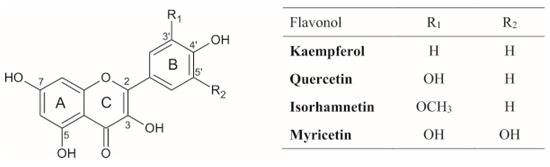 Structures of kaempferol, quercetin, isorhamnetin, and myricetin.