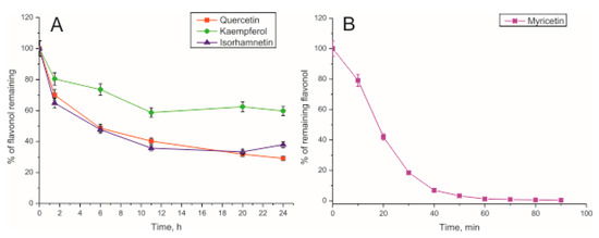 The loss of the starting amount in saliva solution as percent of remaining: (A) kaempferol, quercetin, and isorhamnetin; and (B) myricetin.