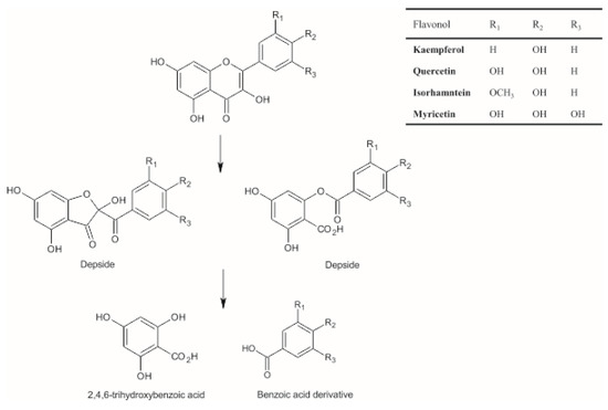Overall, decomposition of flavonols is based on the cleavage of heterocyclic C-ring, with no changes in hydroxyl and methoxy substituents in A-ring and B-ring. Decomposition of myricetin and quercetin leads to the formation of gallic and protocatechuic acid, respectively, which exhibit high redox potential due to the presence of adjacent hydroxyl groups attached to the aromatic ring [43]. Contrarily, vanillic and 4-hydroxybenzoic acids were found to be less efficient in radical neutralization reaction [43].