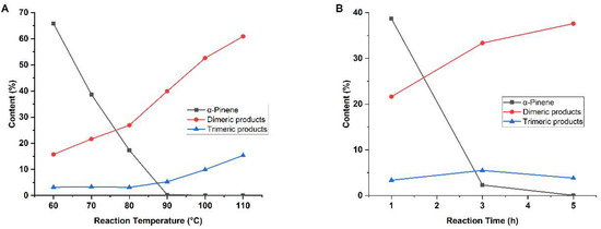 Effect of reaction temperature and reaction time on the conversion of α-pinene and yields of dimeric and trimeric products. The reaction was carried out (A) for 1 h and (B) at 70 °C.