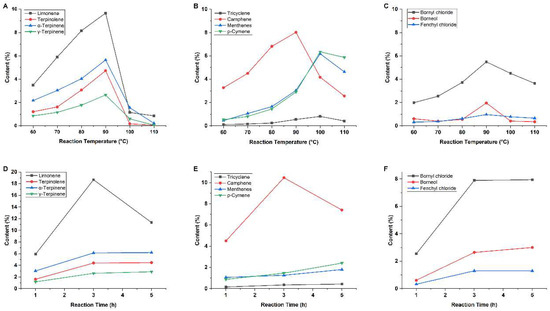 Figure 2A,B show the main hydrocarbon product distribution in the monomeric hydrocarbon region in Figure S1B as a function of the reaction temperature. These monomeric hydrocarbons could be divided into two groups based on the tendency in the content thereof, according to the reaction temperature. Limonene, terpinolene, α-terpinene, γ-terpinene, and camphene except for tricyclene presented a sudden decrease in their yield above 90 °C, meaning their participation in dimerization. On the other hand, the contents of menthenes and p-cymene increased with increasing reaction temperature until 100 °C. These have been reported to form by the disproportionation of p-menthadienes [25]. In our results, the similar contents of menthenes and p-cymene also support the disproportionation mechanism. Meanwhile, as the same as the case of dimeric products, heteroatom-containing monomeric products were also furnished (Figure 2C). Non-negligible amounts of borneol, bornyl chloride, and fenchyl chloride were only produced as bicyclic compounds during the reaction. Figure 2D–F show the distribution of monomeric products with increasing reaction time at 70 °C of the reaction temperature. The considerable amounts of limonene (18.9%) and camphene (10.5%) were produced when α-pinene still remained in the reaction system whereas their yields decreased after the conversion of α-pinene was complete, which denotes their participation in dimerization.