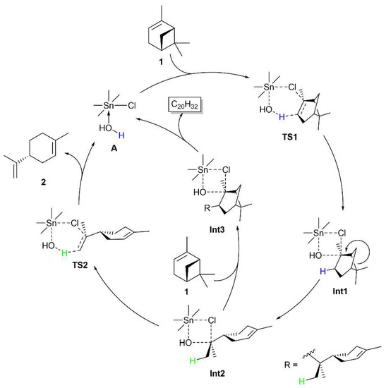 First, the protonation of α-pinene (1) is thought to be promoted by the Lewis acid-assisted Brønsted acid activity of the coordinated water ligands in the Sn(IV) complex (A) via TS1 (Scheme 1). Since there is no polar solvent that can solvate the generated ions, an intimate ion-pair between carbocation and Sn(IV) ate complex should be a reaction intermediate (Int1) [19,30]. To form limonene (2), the main isomerized product from compound 1, the pinanyl moiety in the intimate ion-pair Int1 should suffer from a ring-opening rearrangement, which generates a carbocation/Sn(IV) ate complex ion-pair (Int2). In this intimate ion-pair Int2, the abstraction of a proton from the carbocation moiety by the hydroxo ligand via TS2 regenerates stannic complex A and furnishes compound 2 as the product of a catalytic cycle. If the insertion of another compound 1 into the intimate ion-pair Int2 is prior to the proton abstraction step, a carbocation/Sn(IV) ate complex ion-pair (Int3) appears for dimeric hydrocarbons (C20H32) as the product of the catalytic cycle. Along with the case of compound 2, we can construct distinct routes to complete the catalytic cycle involving the possible combination of carbocation/Sn(IV) ate complex ion-pairs, which are able to explain the various isomers and dimeric hydrocarbons from compound 1.