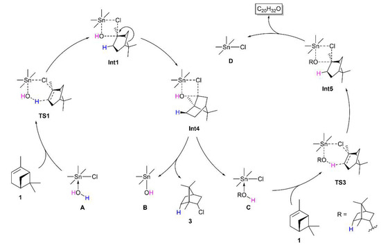 As previously mentioned, for the conversion of α-pinene (1) to occur, carbocation/Sn(IV) ate complex ion-pairs (Int1-4) should be reaction intermediates (Scheme 1 and Scheme 2). We considered that these intermediates are essential clues for the explanation of how the oxygen-containing species are formed. While bornyl chloride (3) is formed when the dissociation of chloride ligand (Sn-Cl bond) occurs in the intimate ion-pair Int4, monoterpene alcohols can be formed by the dissociation of hydroxo ligand (Sn-O bond). At this point, the monoterpene alcohols can occupy an empty coordinate site of the stannic center as an alcohol ligand, which generates ligand exchanged Sn(IV) complex (C) (Scheme 2, right circle). Since the same Lewis acid-assisted Brønsted acidic water ligands work as both catalysts and reactants, this alcohol ligand can also protonate another compound 1, furnishing a carbocation/Sn(IV) ate complex ion-pair (Int5) via TS3. From this intimate ion-pair Int5, the dissociation of the remained alkoxo ligand can cause the formation of dimeric ethers (C20H32O) and decomposed Sn(IV) complex (D).