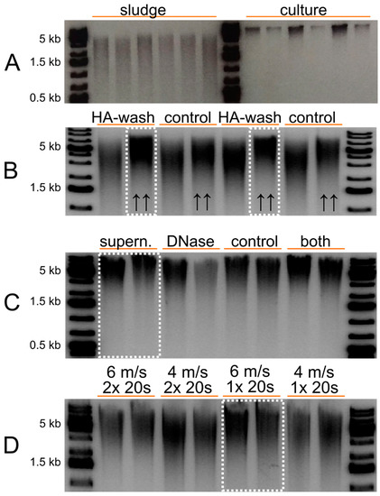 In brief, we first compared the reactor sample with controlled-growth culture samples using the DNA isolation kit from the FastDNA Spin Kit for Soil (MP Biomedicals) according to the manufacturer. As expected, we observed more digested DNA in the sludge samples, with significantly lower DNA length to yield ratio than in the cultures (Figure 1A). To improve overall DNA yield and fragment length, we modified the washing steps and the total amount of sludge sample used. The DNA yield could be slightly increased by increasing the amount of sludge used. Performing an additional humic acid (HA) washing step improved the yield and reduced the number of smaller DNA fragments. Both steps combined yielded the best overall results (Figure 1B). More additional washing steps with the default buffer did not improve the results further (data not shown).