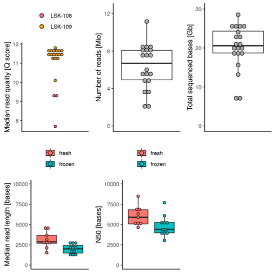 We observed a slight decrease in N50 and median read length for pre-frozen samples compared with fresh samples. Sequencing runs via LSK-108 Kits were also performed using flow cells stored for 2 months or longer, which is likely the main reason for the decrease in median Q-score. We did not observe a Q-score reduction of pre-frozen samples on the basis of sample age. Total sequencing yield varied between 18.2 and 28.5 Gb for most samples and, across all samples, we achieved an average of 20.5 Gb. Total sequencing yield was below 10 Gb for only 2 of the 20 samples (03-SW and 04-SW). An average of 6.3 Mio reads per sample could be retrieved while two samples (03-SW and 04-SW) had only 2.1 and 2.0 Mio reads.