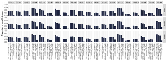 Proportion of taxonomically classified reads of each reactor sample at phylum, genus, and species levels after filtering. The four columns for each reactor represent different read classification approaches. The first bar represents Illumina reads using the Genome Taxonomy Database (GTDB)-Méric index for direct comparison against nanopore sequencing.