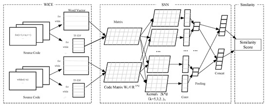 Input Layer: We take a pair of pre-trained word embedding matrix in previous part as input for WICE-SNN model, , here N1, N2 is the number of words respectively in source code A and B, d is the vector dimension. We pad the two code snippets with 0 to have the same length . After filling with 0, the initialized marix .